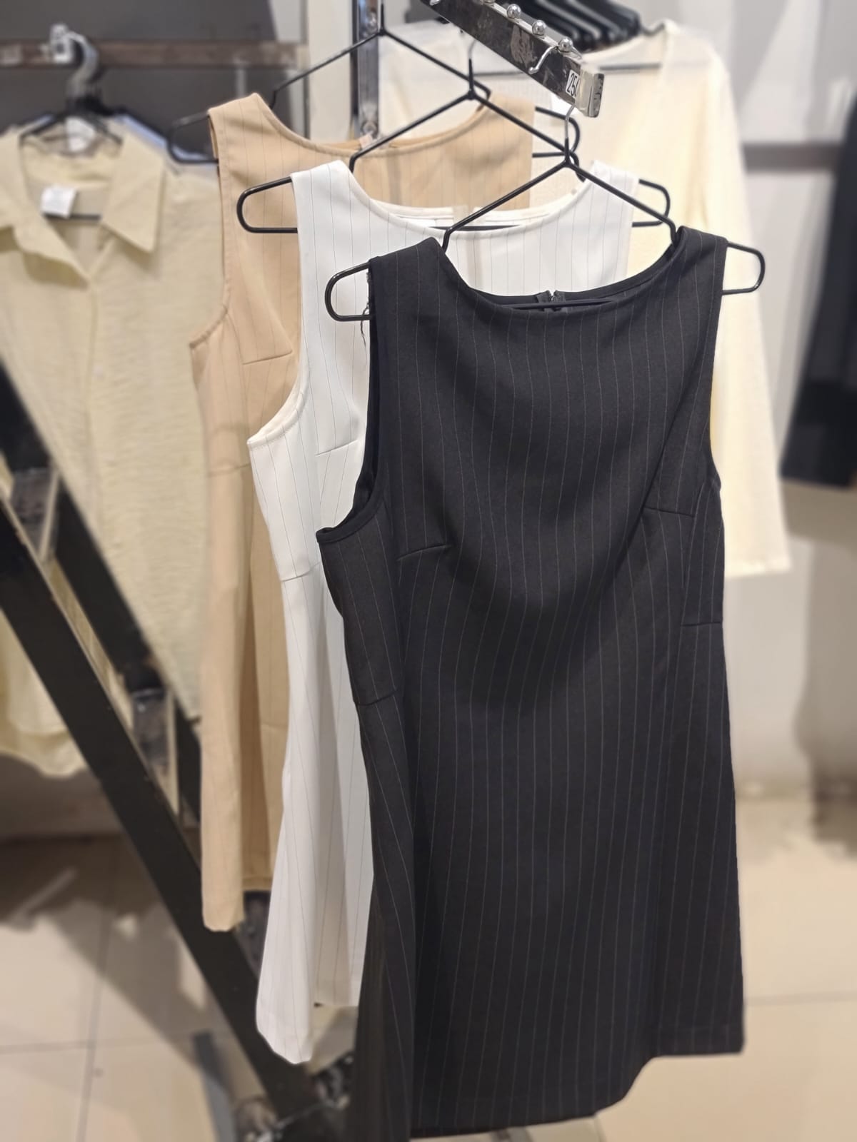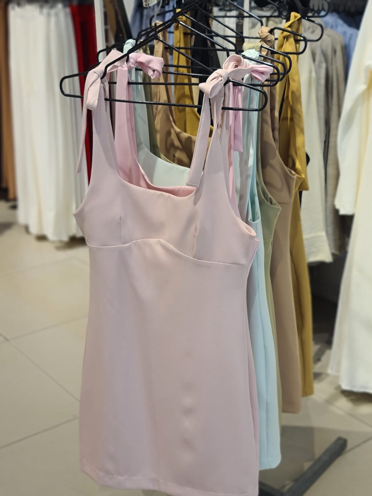 Vestido de estilo entallado con cierre invisible en la parte baja de la espalda y escote pronunciado sobre ella. Cuenta con lazos sobre los hombros para regular.