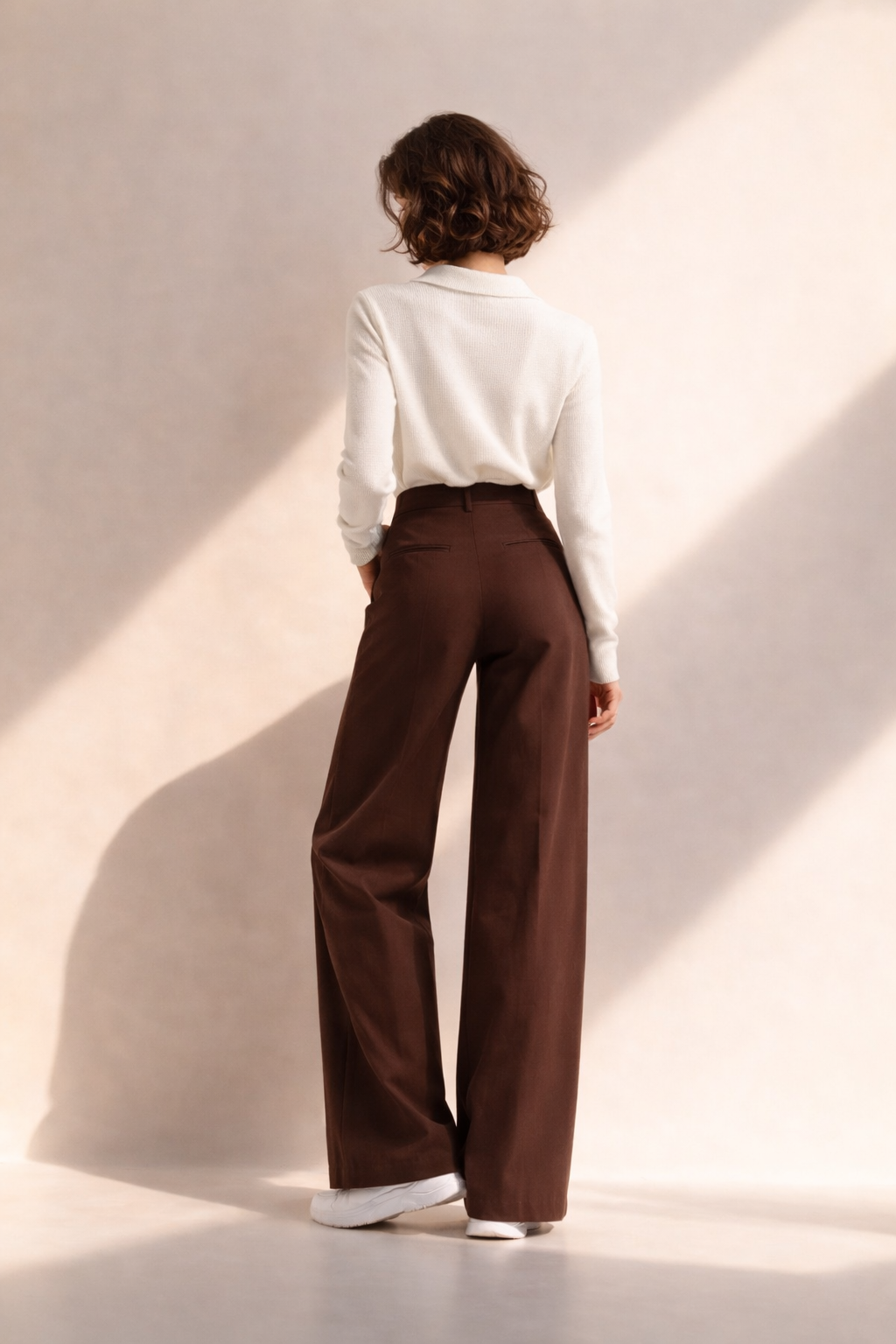 Pantalón sastrero palazo de tiro alto. Tiene bolsillos falsos en la parte trasera