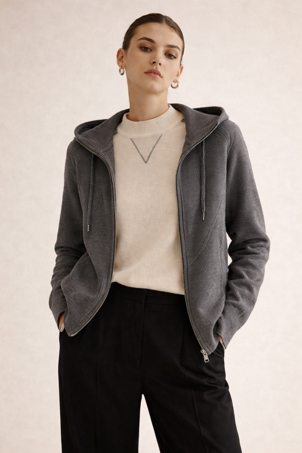- Capucha amplia con caída natural