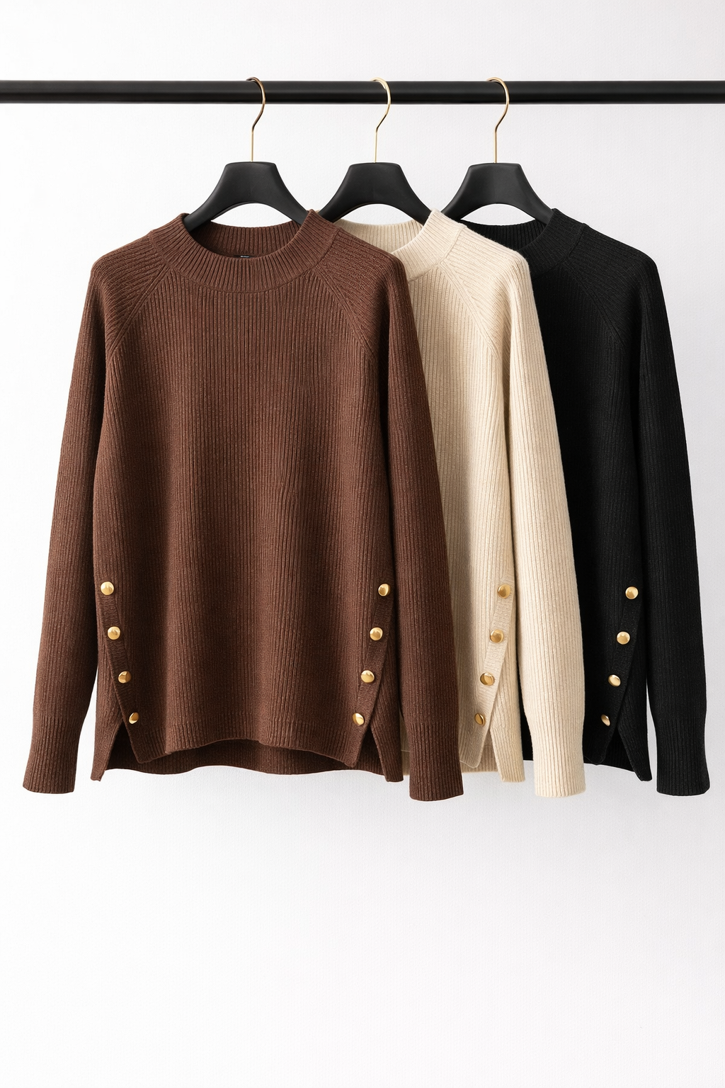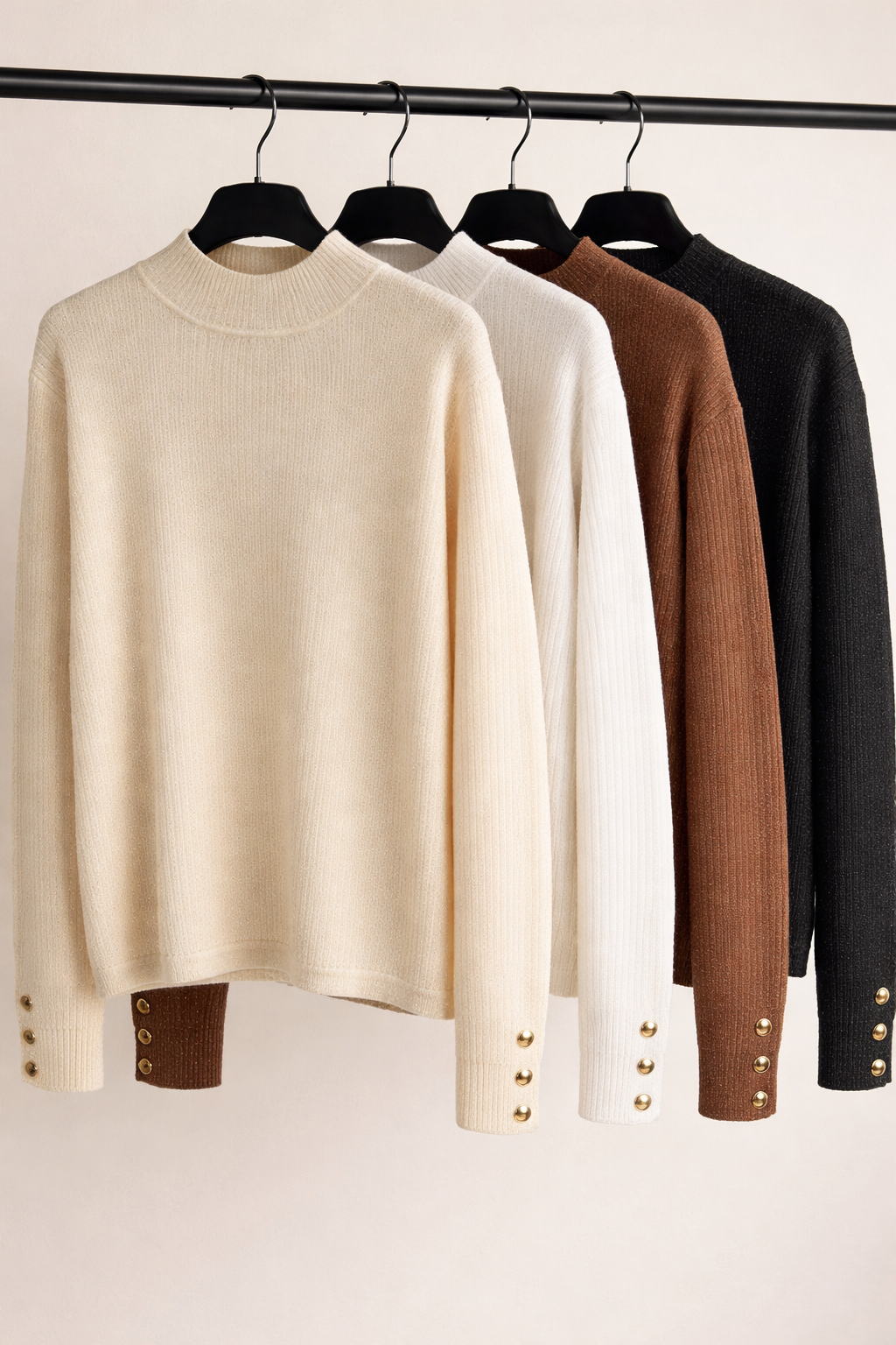 $22,000.00Sweater de tejido acanalado fino con leve elasticidad. Su textura incorpora delicados destellos en tono dorado claro, presenta cuello alto corto con terminación acanalada más marcada. Las mangas son largas y ajustadas, con un detalle distintivo: botones metálicos dorados en los puños que suman un toque sofisticado.