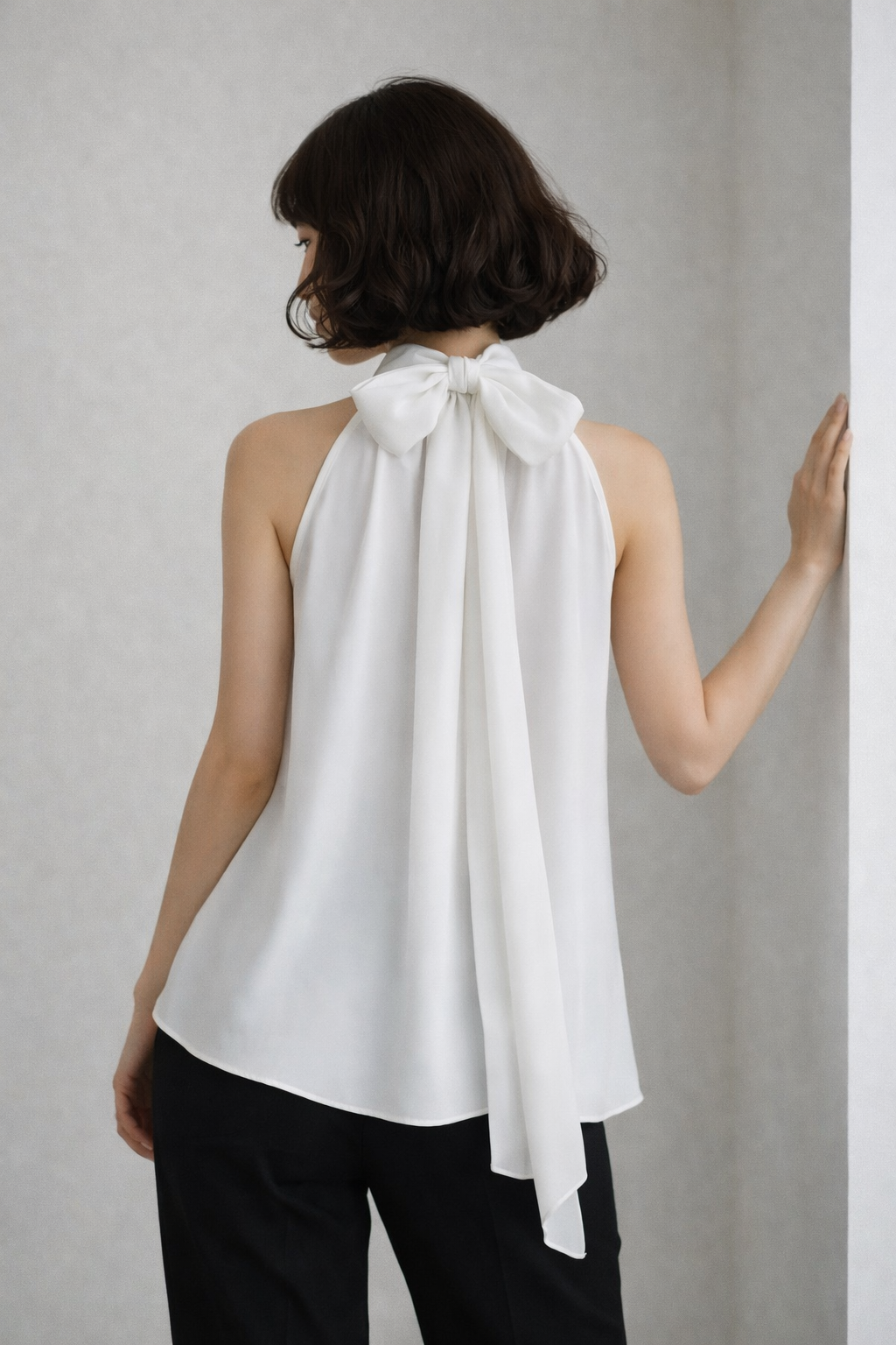 Presenta un cuello alto con leve frunce que genera volumen en la parte superior, acompañado de un sutil tajo frontal que deja ver la piel de manera delicada. Su calce suelto