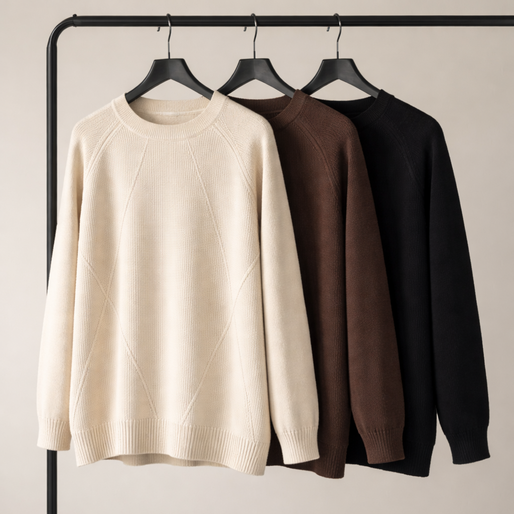 Sweater de tejido suave con caída natural Cuenta con cuello redondo levemente bajo, mangas raglán y líneas geométricas sutiles en el frente que aportan diseño y estilo.