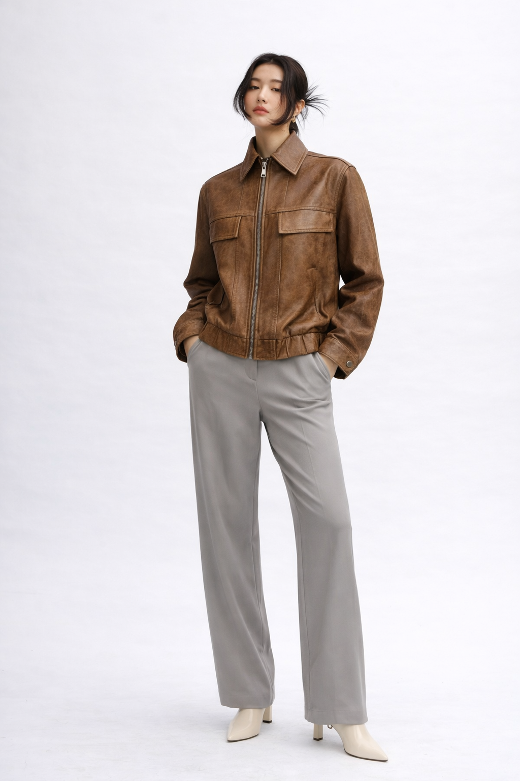 Campera de calce relajado confeccionada en material símil cuero. Presenta cuello camisero clásico y cierre frontal metálico, combinando estructura y estilo en una prenda versátil para uso diario.