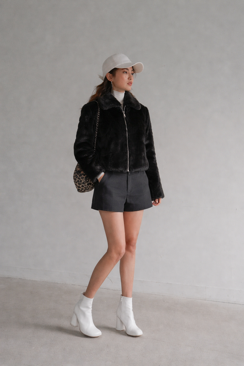 Saco corto confeccionado en textura de pelo sintético, con acabado suave y visual voluminoso.