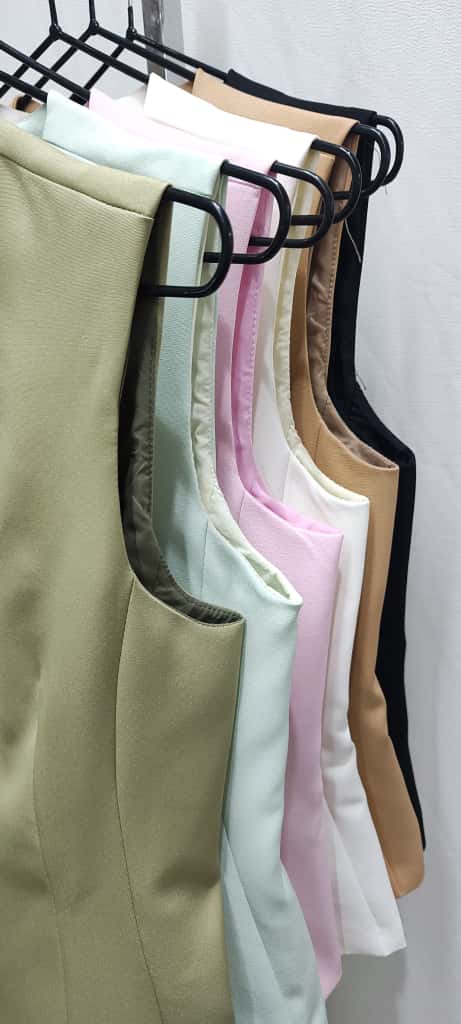 Chaleco entallado con un lazo para regular en la parte posterior. Cierre con 3 botones.