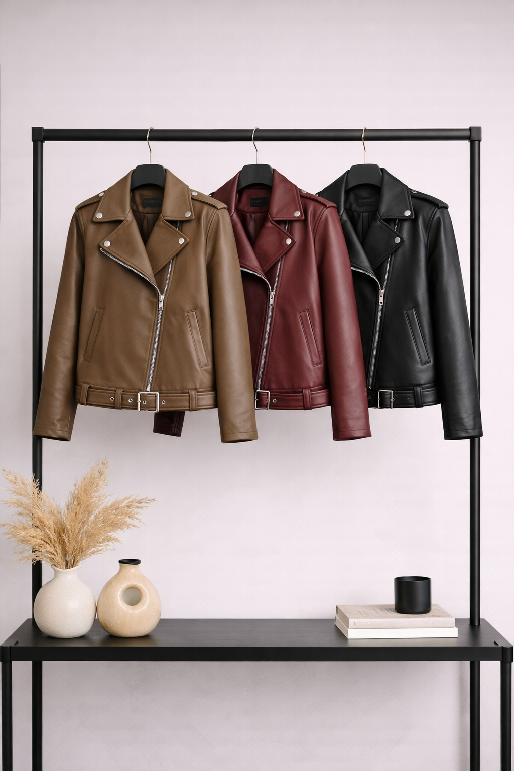 Campera estilo biker confeccionada en material símil cuero de acabado suave y levemente satinado
