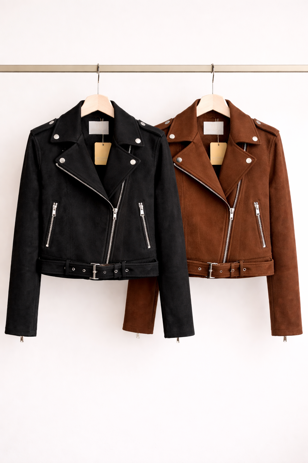Chaqueta corta de gamuza con cinto en la cintura y bolsillos en los laterales