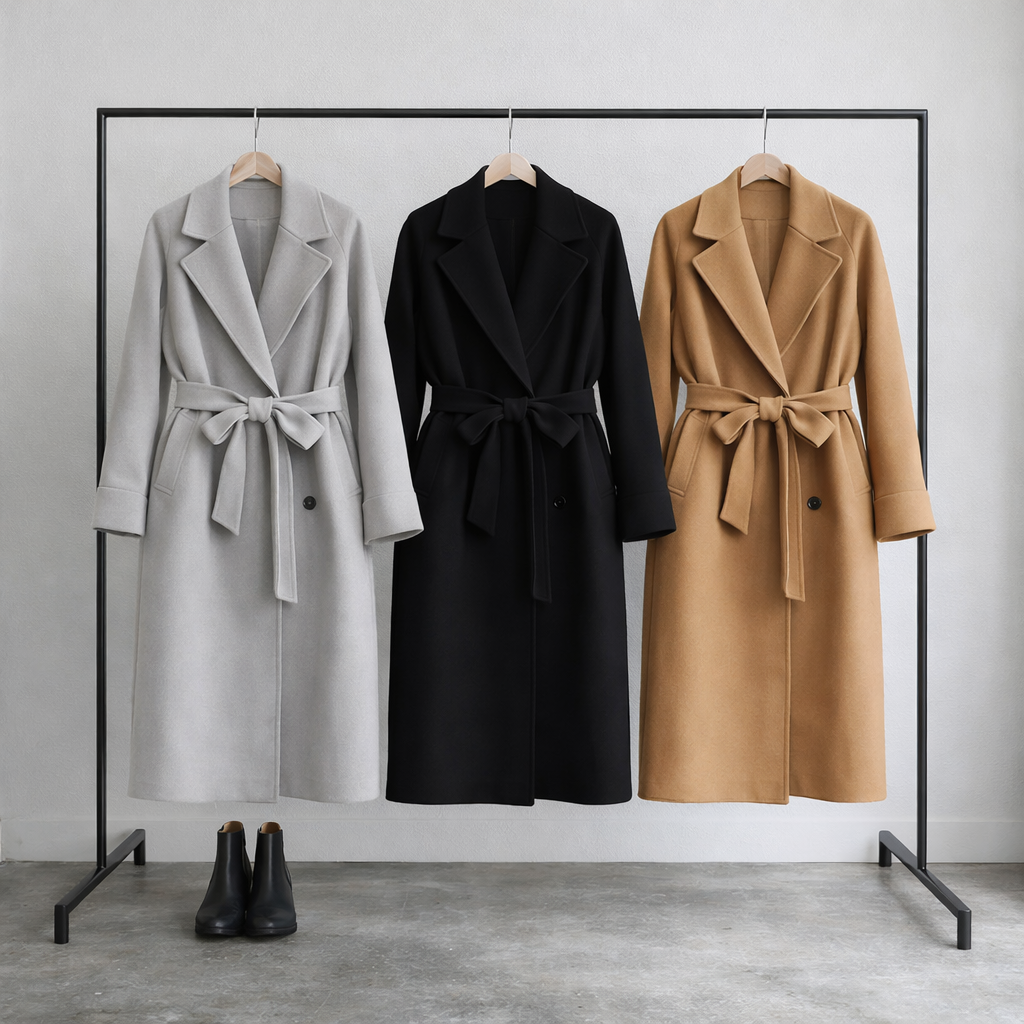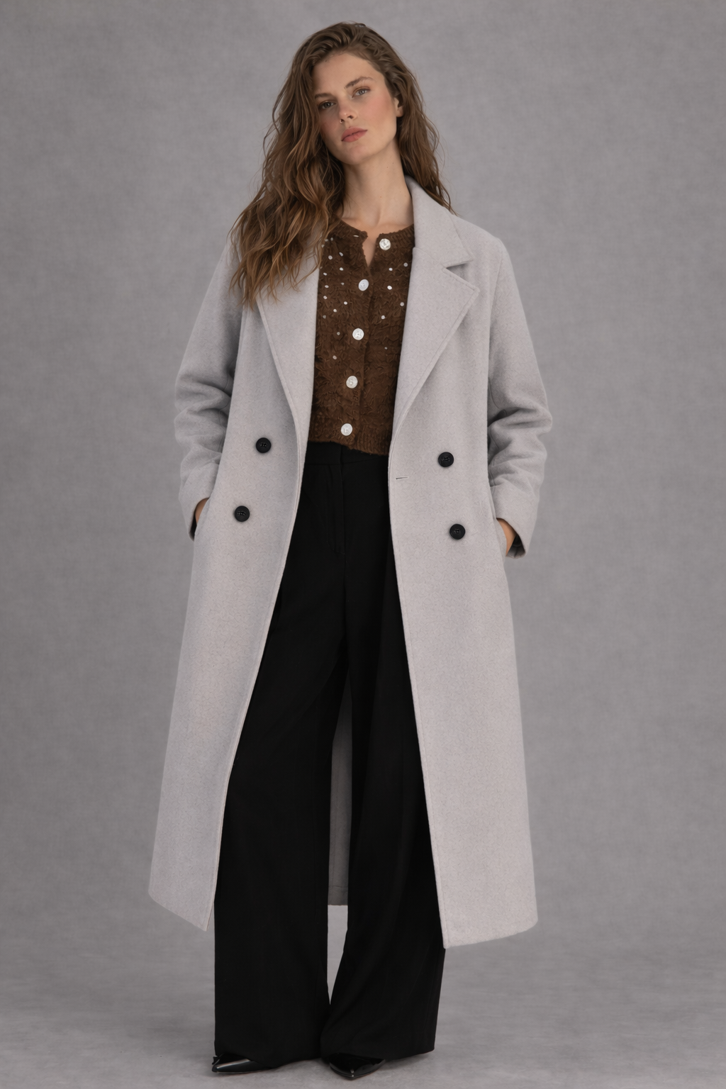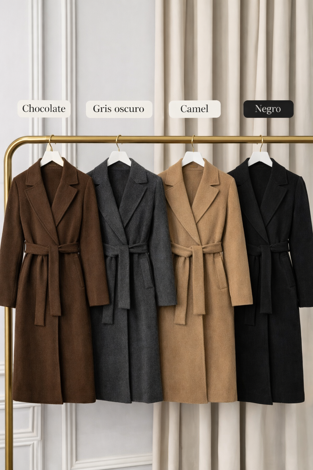 Saco largo estilo trench , con detalle de 4 botones y lazo para ajustar en la cintura. Bolsillos laterales.